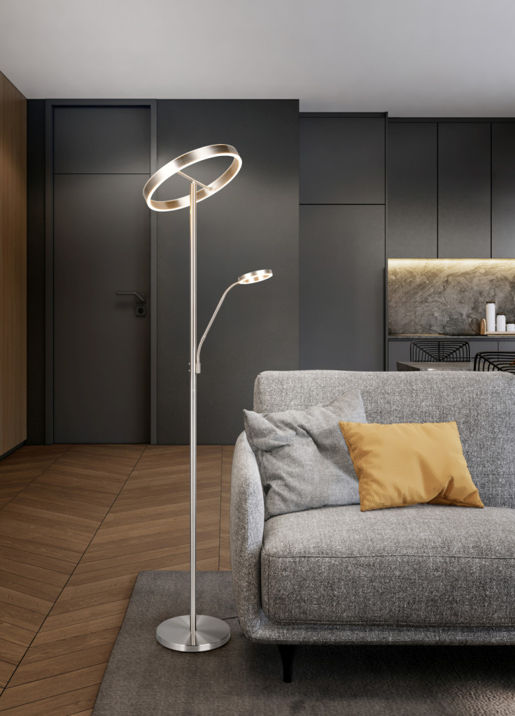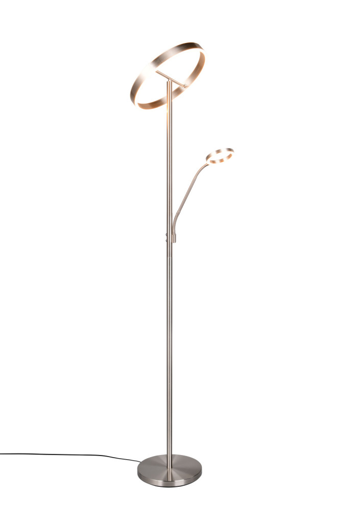 Beépített LED-es állólámpa matt nikkel színben, olvasókarral, mely modern designjával vonza a tekintetet. Az innovatív formának köszönhetően különleges fényeket varázsolhatunk a szobába.