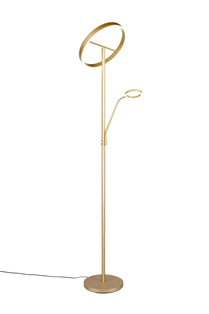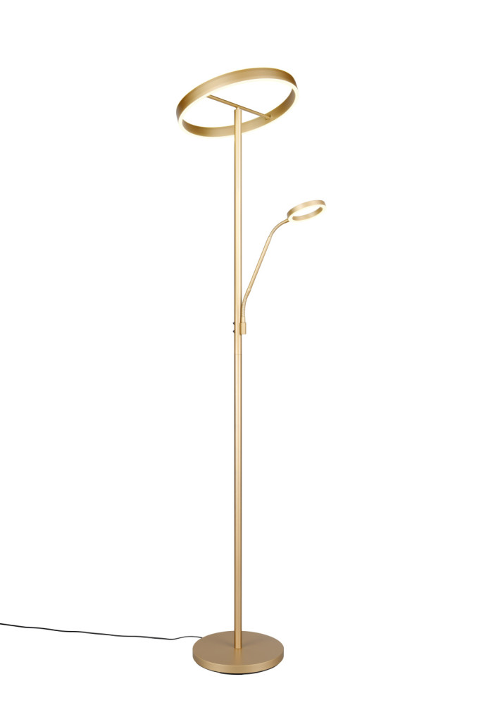 Beépített LED-es állólámpa arany színben, olvasókarral, mely modern designjával vonza a tekintetet. Az innovatív formának köszönhetően különleges fényeket varázsolhatunk a szobába.